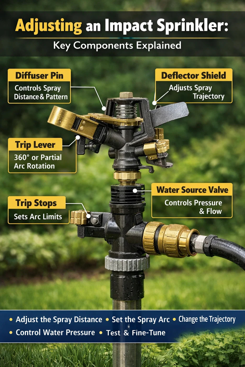 La respuesta corta es sí: los aspersores de impacto se encuentran entre las herramientas de riego más ajustables disponibles. En la mayoría de los casos, puede cambiar el arco de pulverización, la distancia del agua, el patrón del chorro y la dirección de rotación sin herramientas especiales. Ya sea que se trate de un aspersor de impacto básico con extremo de manguera o de un sistema de impacto emergente más complejo, casi todos los aspectos funcionales se pueden ajustar para que coincidan con la forma y el tamaño de su zona de riego. La clave es saber qué parte controla qué comportamiento, porque cada componente hace un trabajo específico.