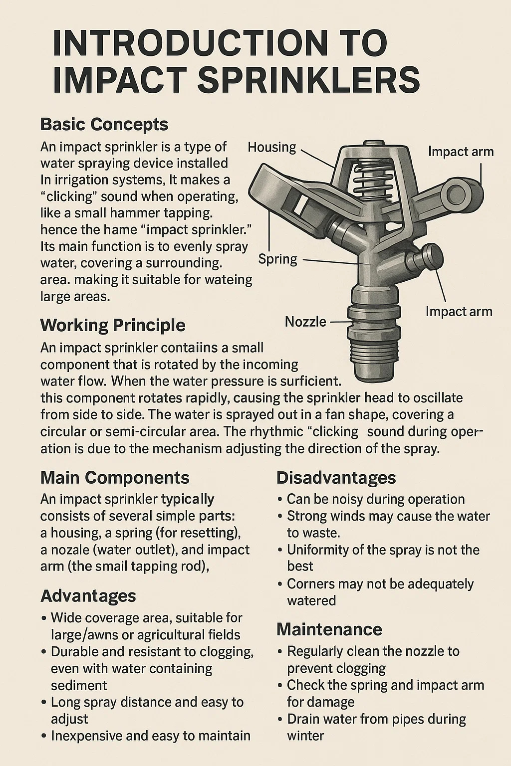Un aspersor de impacto es un tipo de dispositivo de pulverización de agua instalado en sistemas de riego. Emite un sonido de "clic" cuando está en funcionamiento, como un pequeño golpe de martillo, de ahí el nombre "aspersor de impacto". Su función principal es rociar agua de manera uniforme, cubriendo un área circundante, por lo que es adecuado para regar grandes superficies.