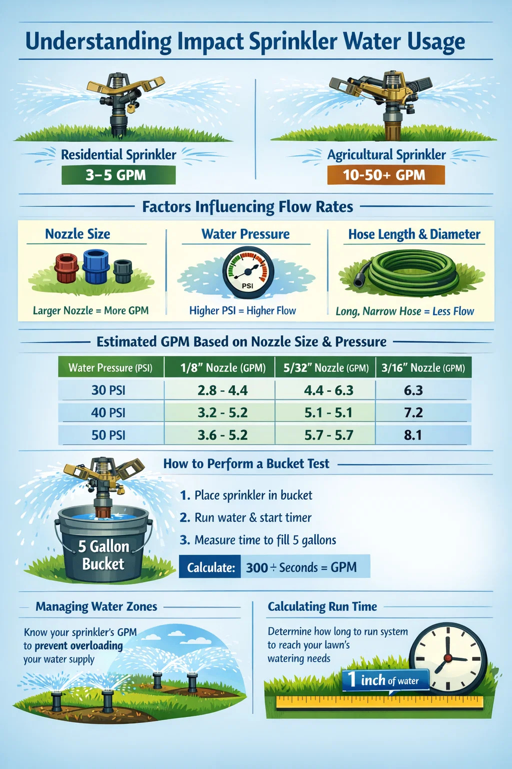 Un residencial estándar aspersor de impacto normalmente se utiliza entre 3 a 5 galones por minuto (GPM) . Sin embargo, este caudal depende en gran medida del tamaño de la boquilla y de la presión del agua (medida en PSI) en el grifo. Para los aspersores de impacto agrícolas de servicio pesado, el uso puede aumentar significativamente, desde 10 a más de 50 GPM por unidad.