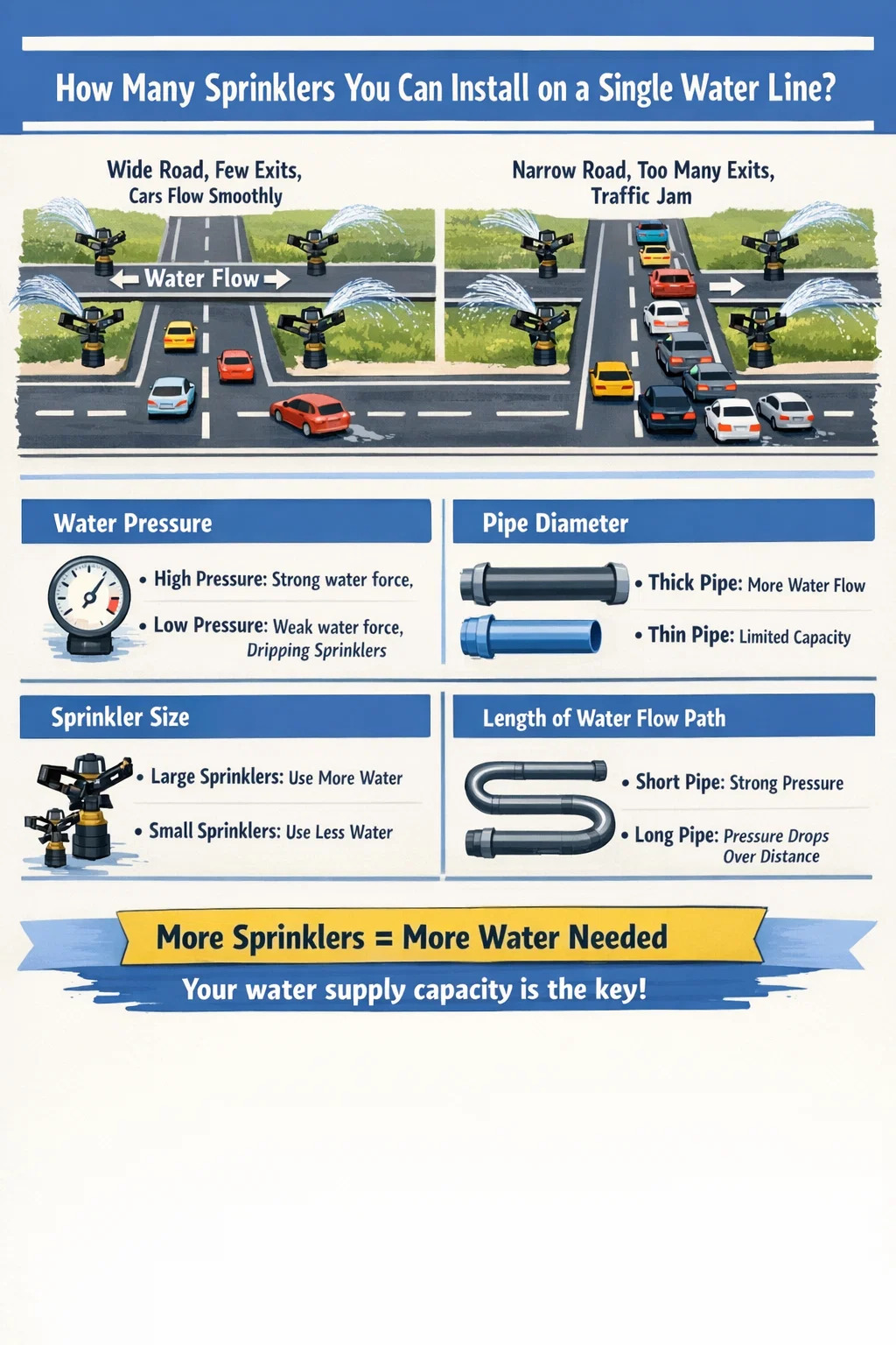 Puedes imaginar la tubería de agua como una carretera, el flujo de agua como automóviles y los aspersores de impacto como salidas. Si la carretera no es lo suficientemente ancha y hay demasiadas salidas, los coches no podrán circular.