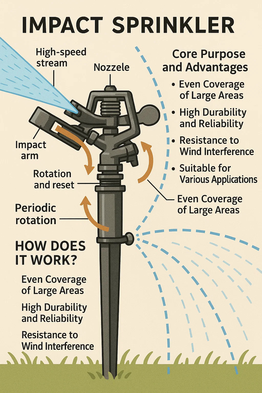 La función principal de un aspersor de impacto es proporcionar un método confiable y eficiente para distribuir uniformemente el agua en grandes áreas. Son herramientas muy comunes en horticultura, agricultura y riego de jardines.